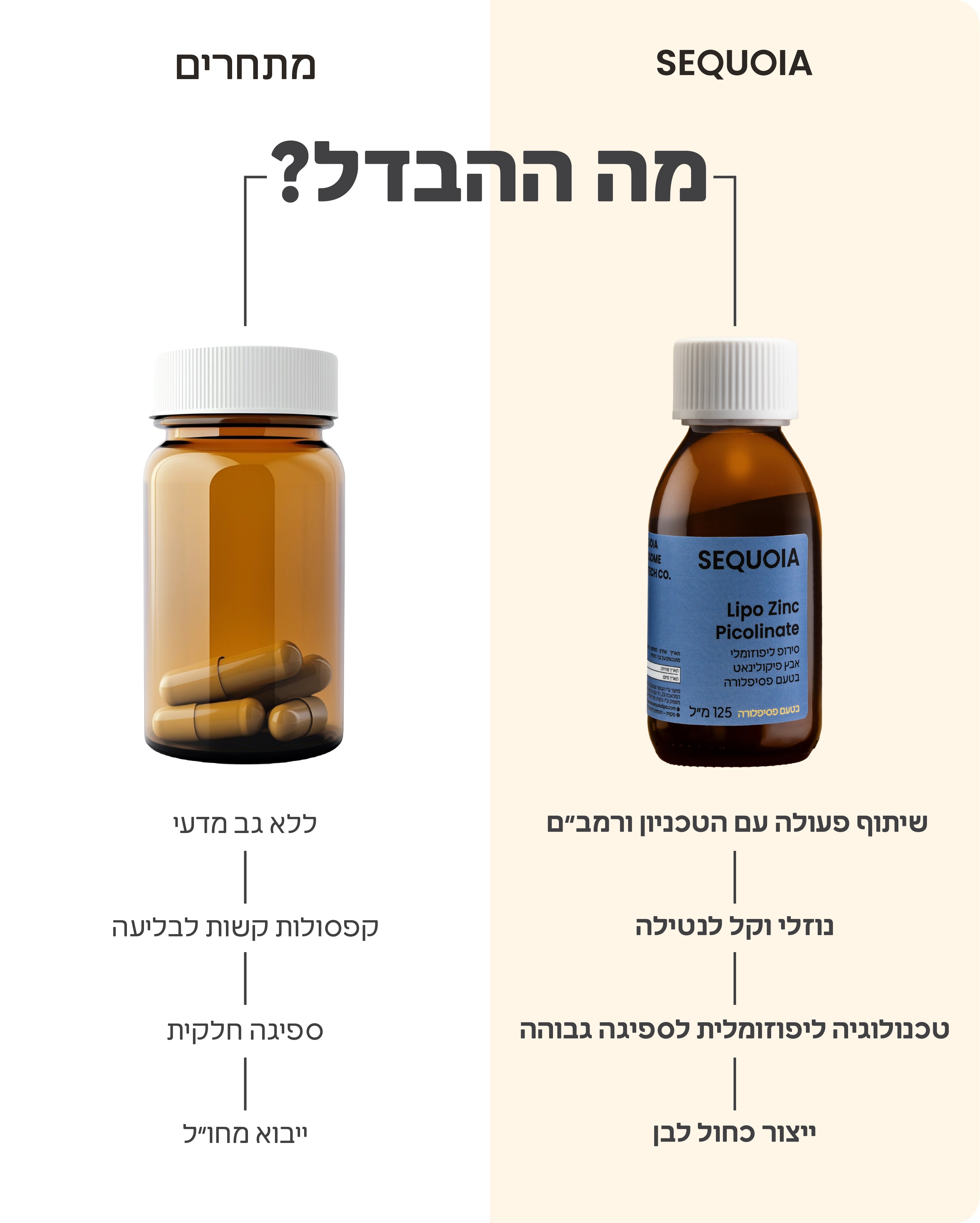 תוסף תזונה המכיל אבץ פיקולנאט ליפוזומלי מיועד להשלמת תזונת האבץ היומית, ותומך במגוון תהליכים חיוניים בגוף, כגון תפקוד תקין של מערכת החיסון, שמירה על עור תקין וסיוע בשמירה על מבנה השיער והציפורניים.