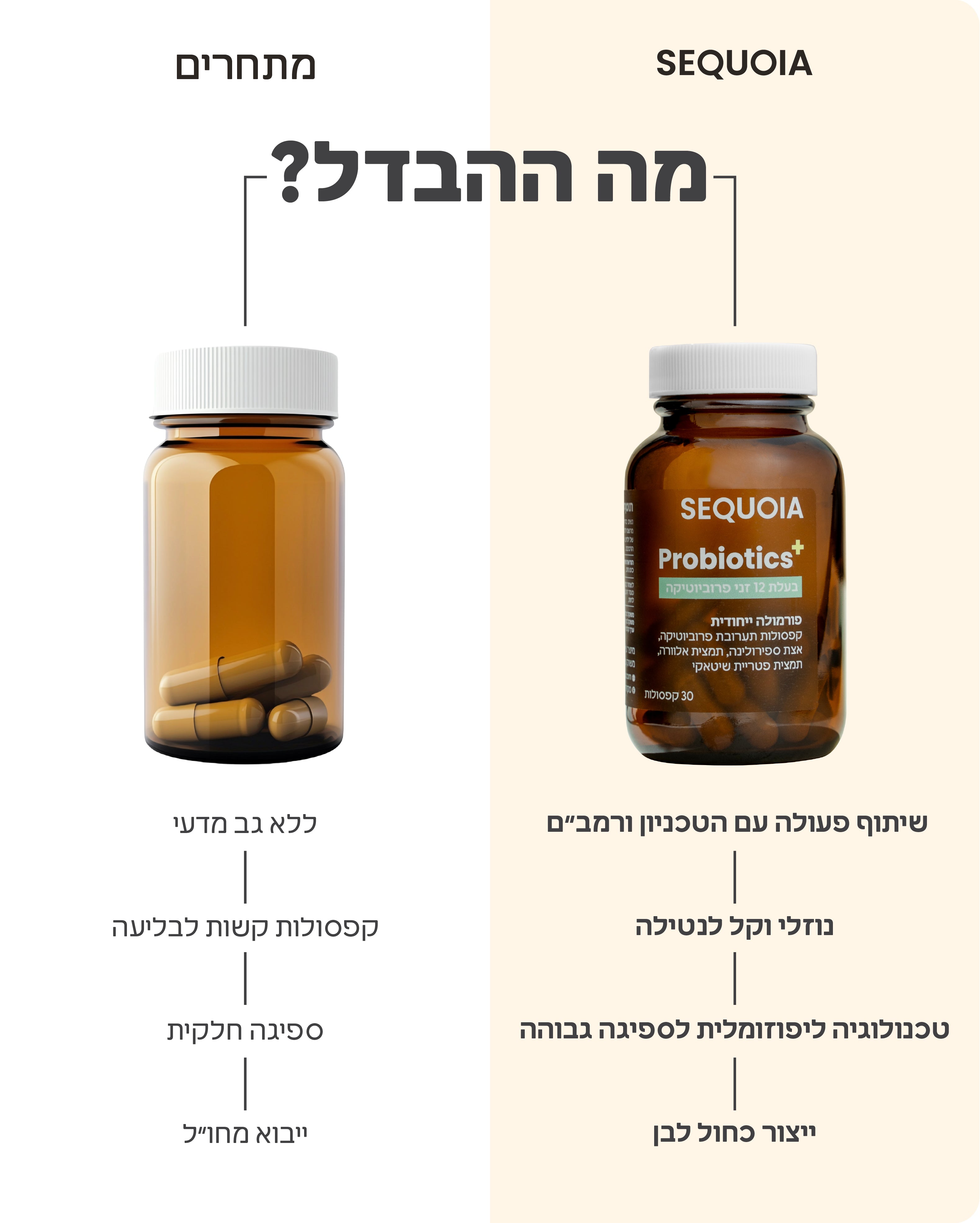 תשכחו כל מה שחשבתם שאתם יודעים על פרוביוטיקה - אנחנו מציגים את הדור הבא! הפורמולה החדשנית שלנו משלבת 12 זני חיידקים פרוביוטיים עוצמתיים, כולל 2 זנים ייחודיים שנוכחותם חשובה בפלורה של מערכות שונות בגוף. בנוסף, הפורמולה כוללת את כוחות-העל של ספירולינה, שיטאקי ותמצית אלוורה. כל כמוסה מכילה 30 מיליארד חיידקים - כדי שהגוף שלכם יהיה מוכן לכל אתגר. זו לא עוד פרוביוטיקה - זו פרוביוטיקה בליגה אחרת.